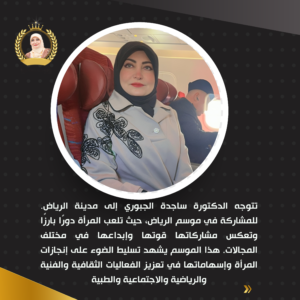 تتوجه الدكتورة ساجدة الجبوري إلى مدينة الرياض. للمشاركة في موسم الرياض، تلعب المرأة دورًا بارزًا وتعكس مشاركاتها قوتها وإبداعها في مختلف المجالات. هذا الموسم يشهد تسليط الضوء على إنجازات المرأة